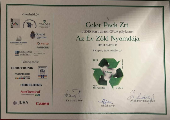 A zsűri elismerő külön oklevele Color Pack Zrt.